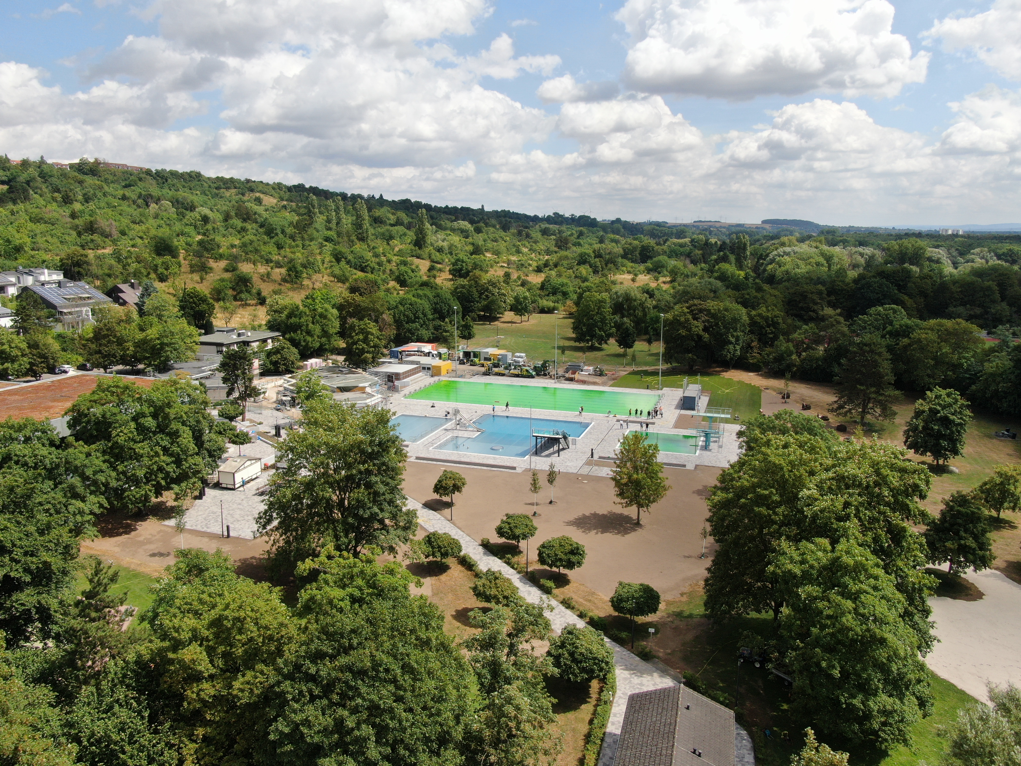 Mit Hochdruck war im Freibad Riedbad Bergen-Enkheim gearbeitet worden – jetzt wurde nach neunmonatigem Umbau auf dem Gelände des alten Bades ein neues, ökologisch ausgerichtetes Freibad eröffnet. Und das pünktlich zu den Sommerferien! Die grundlegende Sanierung war unumgänglich, denn die alten Becken und sanitären Einrichtungen waren nach fünf Jahrzehnten abgenutzt und technisch veraltet.