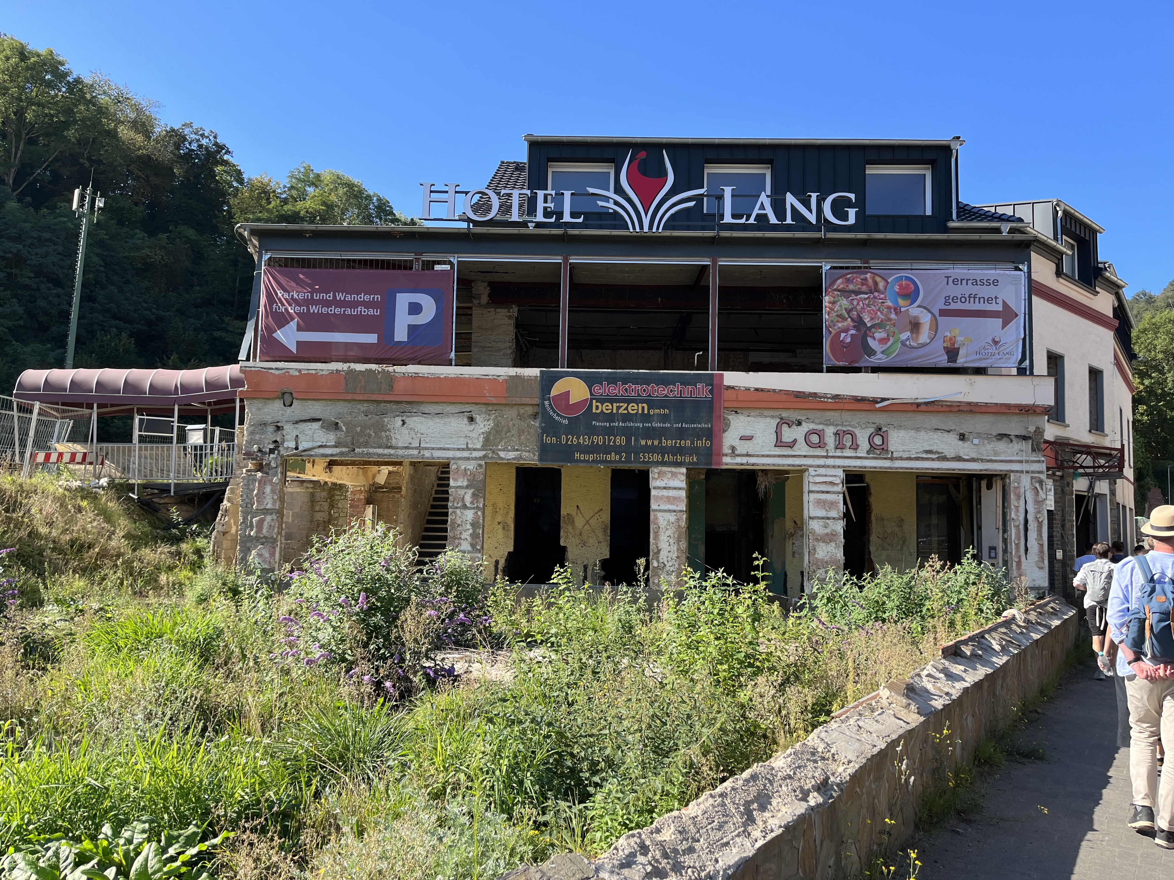 Der Tag im Ahrtal wurde für uns so tatsächlich zu einer Wanderung zwischen den Welten – hier die Narben einer Naturkatastrophe – dort die Romantik des Rotweinwanderweges. Unser Wandertag endete mit der Einkehr bei Lukas Sermann, Winzer und Gastwirt in Ahrweiler. Er hat den zerstörten Familienbetrieb wieder aufgebaut und weitergemacht. Das macht Hoffnung auch für die anderen ortsansässigen Betriebe, die unter den Folgen der Flut schwer gelitten haben!